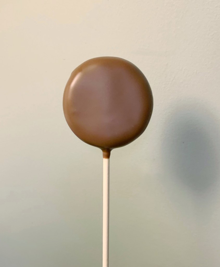 6. Dip peanut butter covered cake pop into melted milk chocolate.